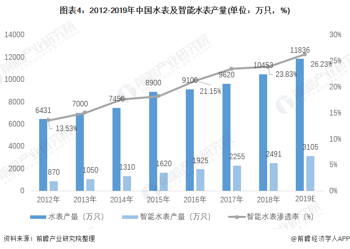 在國家政策和技術的促進下,及依托智能水表在智慧水務發展背景下的獨特的優勢,我國智能水表的滲透率和產量不斷增加。2012年我國水表產量為6431萬只,智能水表產量僅為870萬只,智能水表的滲透率僅為13.53%,不足15%。據統計,至2018年我國智能水表產量超過2400萬只,市場滲透率達到23.83%,預計2019年我國智能水表產量超過3000萬只,市場滲透率進一步提升,將超過26%。
