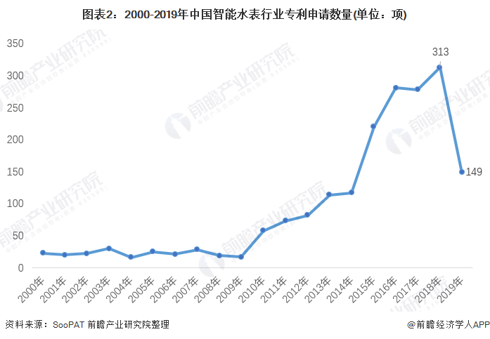 在國家政策的促進下,智慧水務的發展對智慧水表的需求也不斷提升,促進了企業對相關技術的重視, SooPAT公布數據顯示,2000-2018年我國智能水表的專利申請數波動增加,2018年共申請專利313項,2019年智能水表技術發展進入穩定沉淀期,天津水處理設備專利申請數有所下降,為149項。